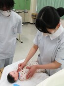 学生たちは、優しい声かけやビックリさせないように配慮をしながら、本物の赤ちゃんと接するように演習を行いました。