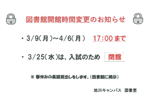 ☆図書館開館時間変更のお知らせ☆(3/9~4/6) | 医療福祉の資格は54年の伝統校 旭川荘厚生専門学院